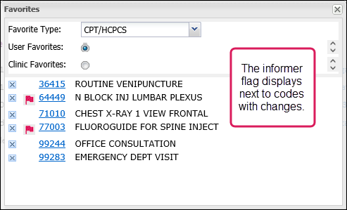 In the Show Favorites window, an Informer flag displays next to codes with changes. Click a code to navigate to the code detail page. On the detail page, click