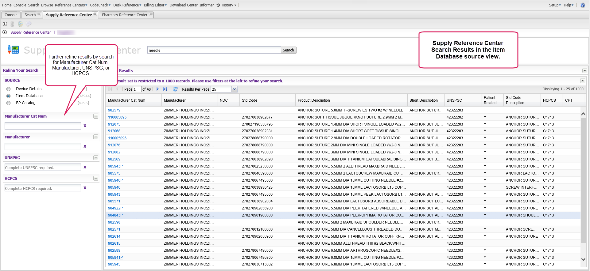 The Supply Reference Center allows users to search for medical devices and products by code, item description, or manufacturer name in one single location. Search results display in grid format with a collapsible Refine Your Search panel to the left.