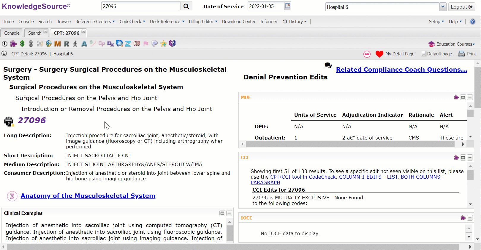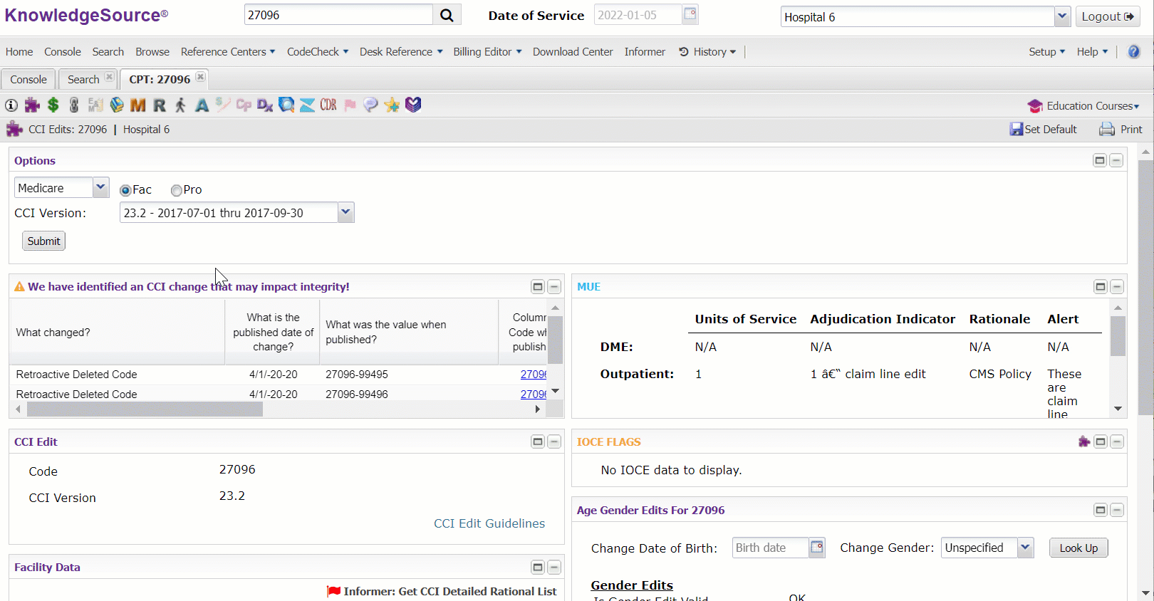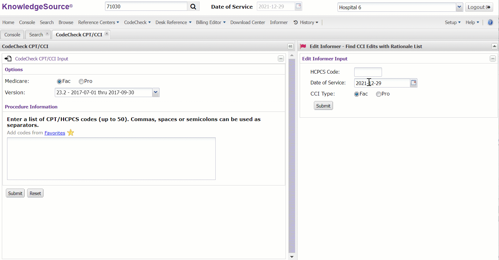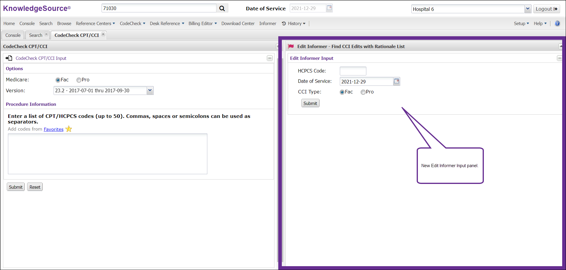 A new Edit Informer panel is available on the CodeCheck > CPT/CCI page that allows users to view CCI edits with detailed rationale information. This saves users the time of searching for edit rationale information elsewhere.
