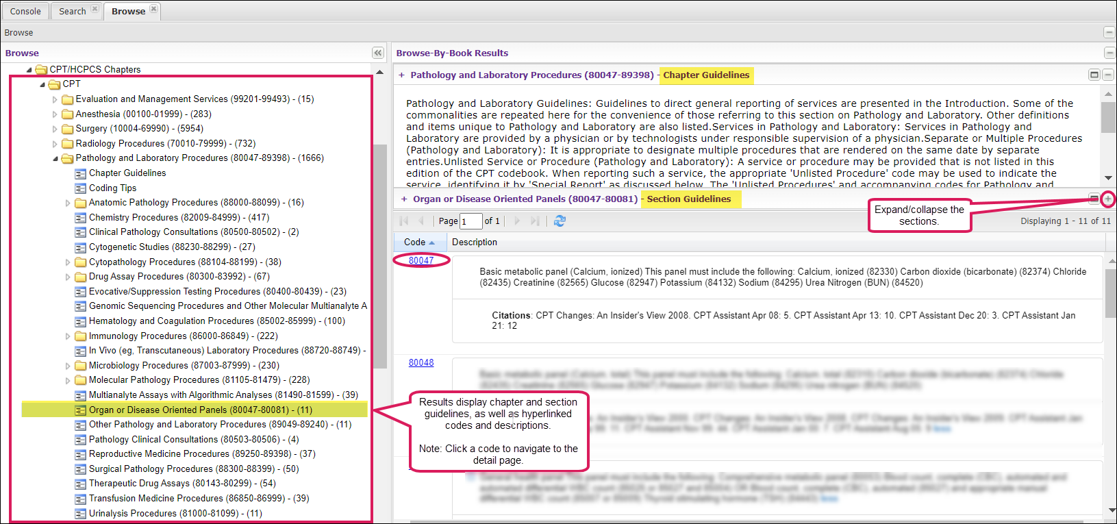 Contains AMA CPT® and CMS HCPCS Level II chapters by code set. CPT CollectionThe CPT collection lists coding topics and code sets in the order that they appear in the AMA CPT® coding book. Within each topic the following details display when available: chapter or section guidelines, coding tips, citations, notes, and CPT Guidelines appendices. HCPCS CollectionThe HCPCS collection lists code sets by topic in alphabetical order. The results display a hyperlinked code and description. |
