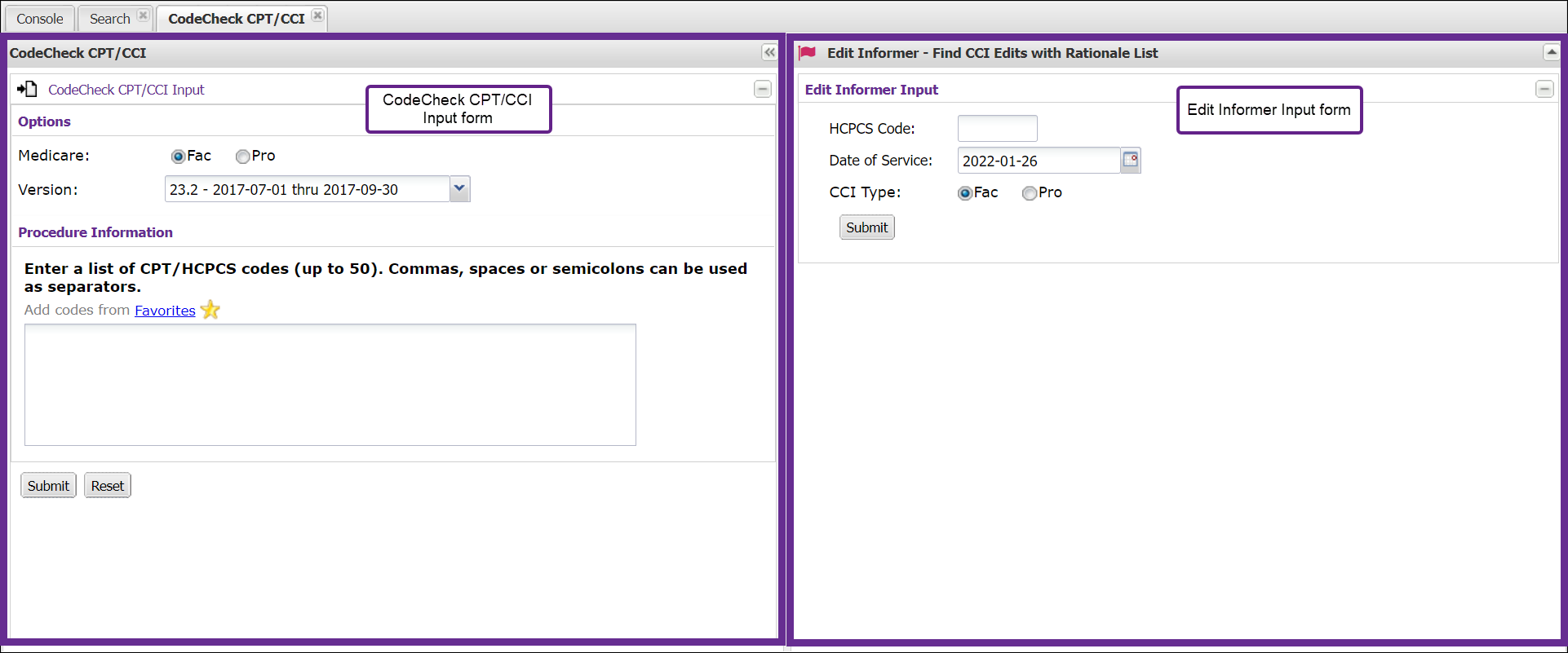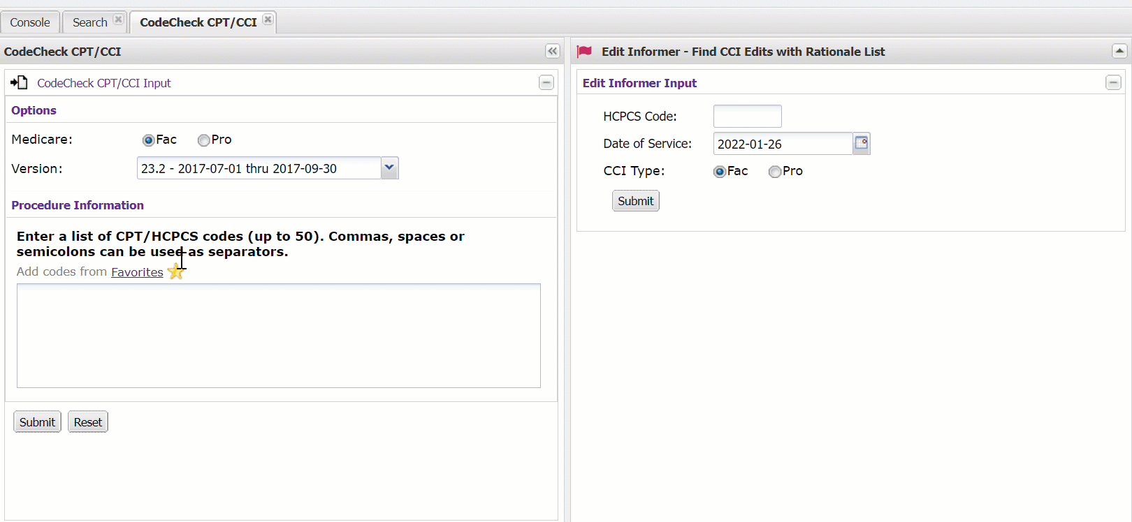 The CodeCheck CPT/CCI interface allows you to check for CCI (Correct Coding Initiative) bundling edits, and test up to 50 CPT/HCPCS codes for CCI bundling edits. Additionally, you can view CCI edits with detailed rationale information.
