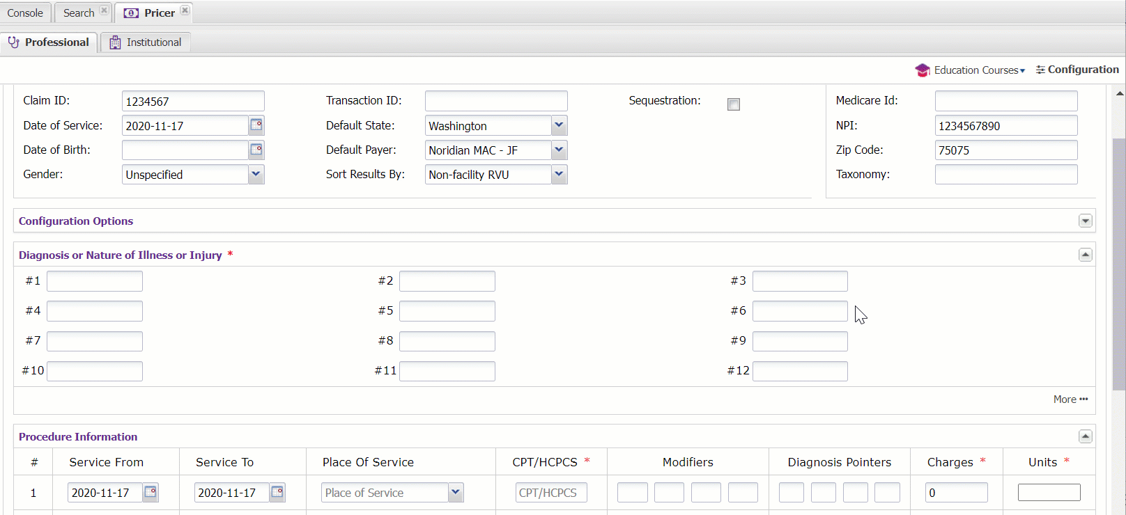 The Pricer forms allow you to manually enter claim demographics and provider details, as well as diagnosis and procedure information.