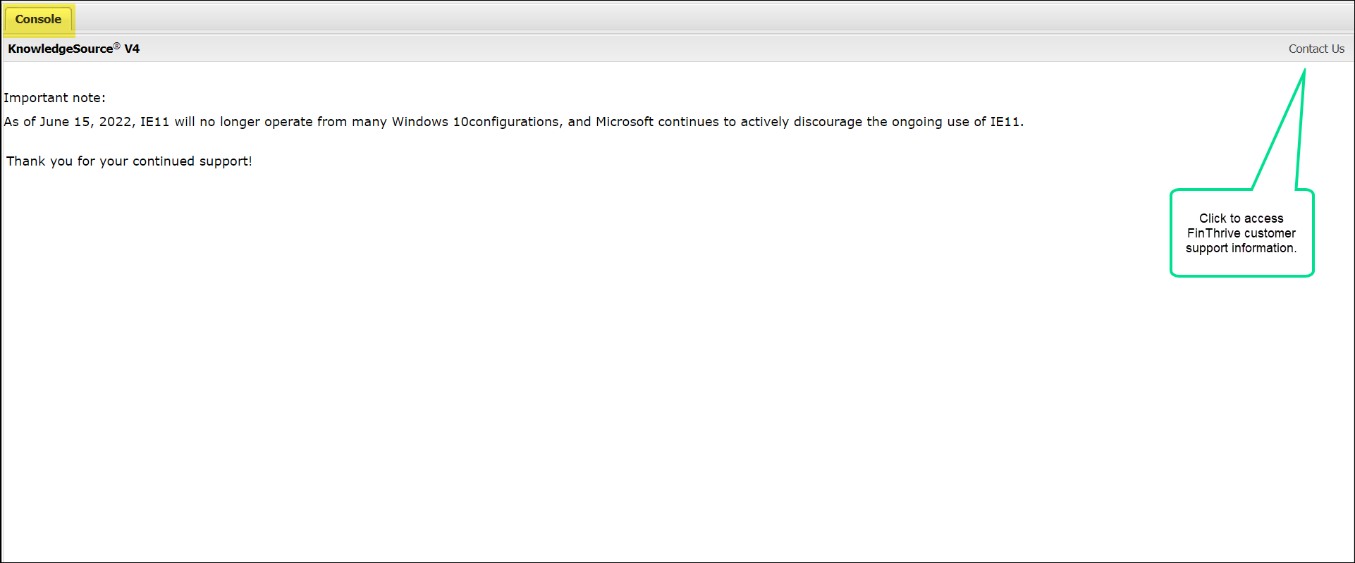 The Knowledge Source Console page allows you to clear all open tabs with one click. The Console page sometimes contains important notes for Knowledge Source users. Click the Contact Us button to access FinThrive customer support information.