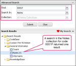 - Perform an advanced search for a code in the Notes knowledge database. If there are notes for the code, the number of notes results displays in parenthesis next to the Notes collection in the Search Results panel.