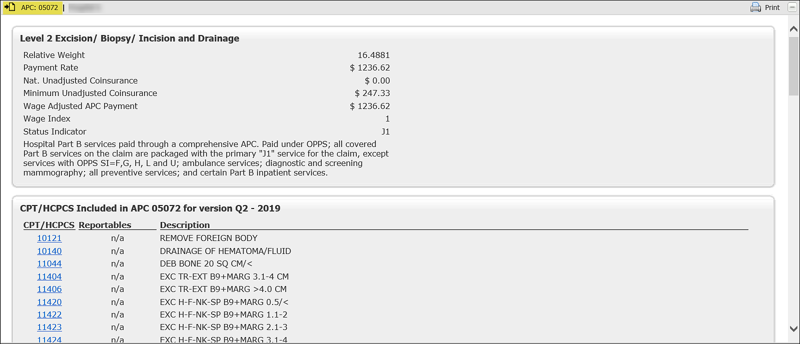 The APC detail page gives you a list of all associated CPT/HCPCS codes that are paid under the respective APC.