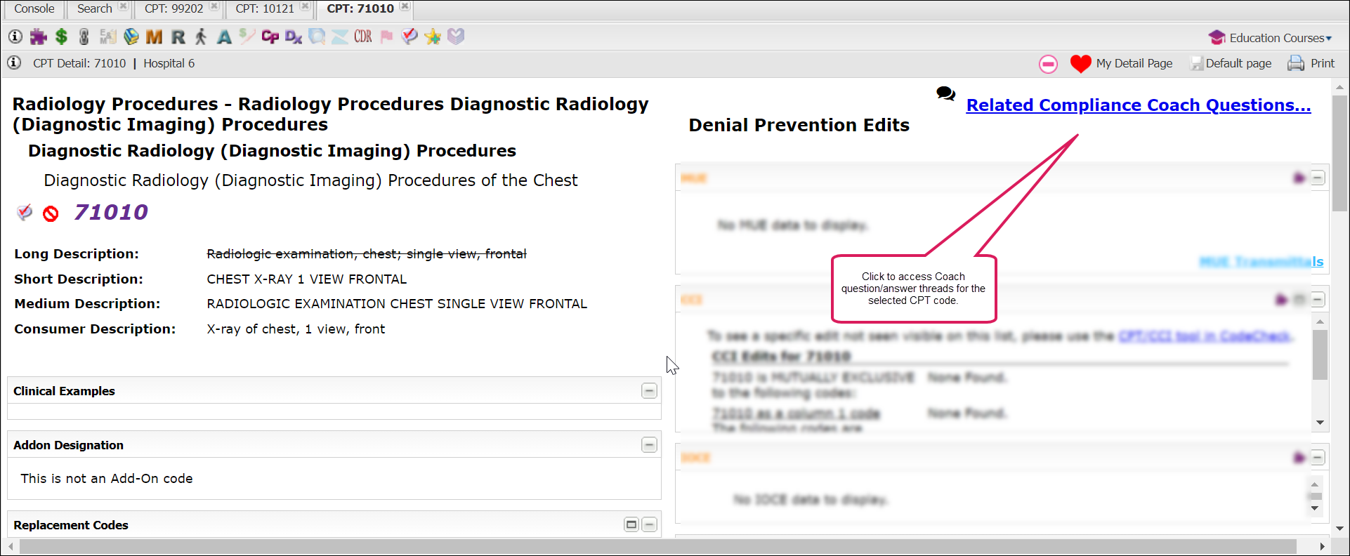 If there are Coach questions related to your CPT/HCPCS code, the Compliance Coach Questions link is available.