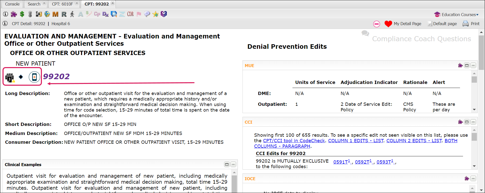 Indicator icons may display next to the CPT/HCPCS code. These highlight important details you need to know about the code. Hover over an icon to view a description in a tooltip.