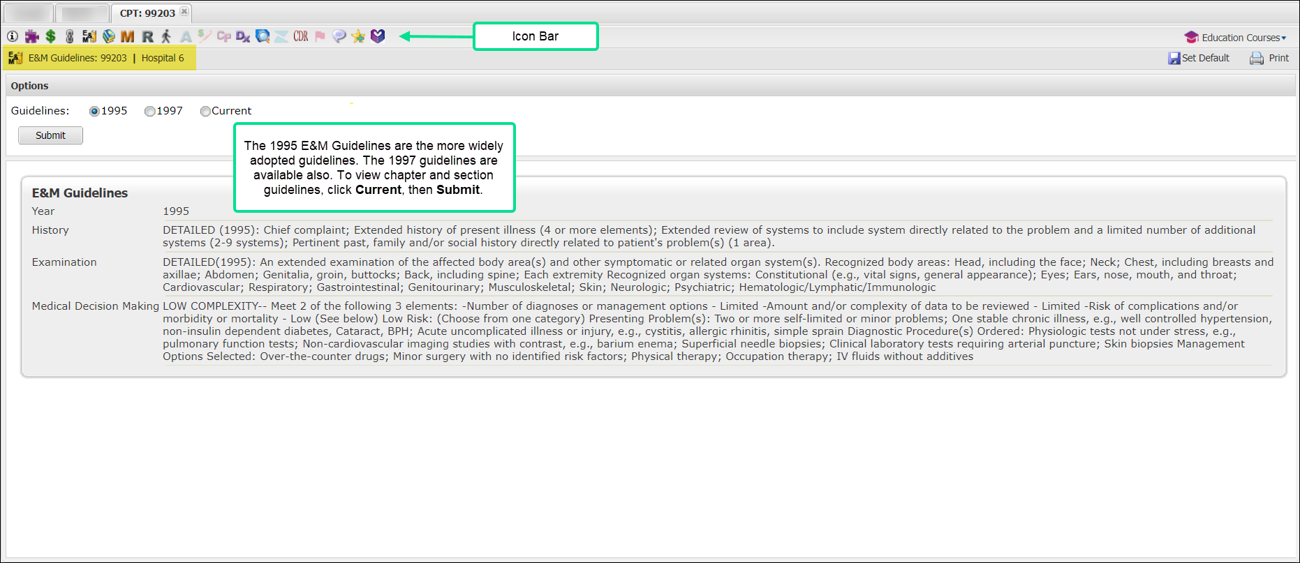 . The E&M detail page opens in the same tab opens by default to the 1995 guidelines as these are generally more widely adopted.