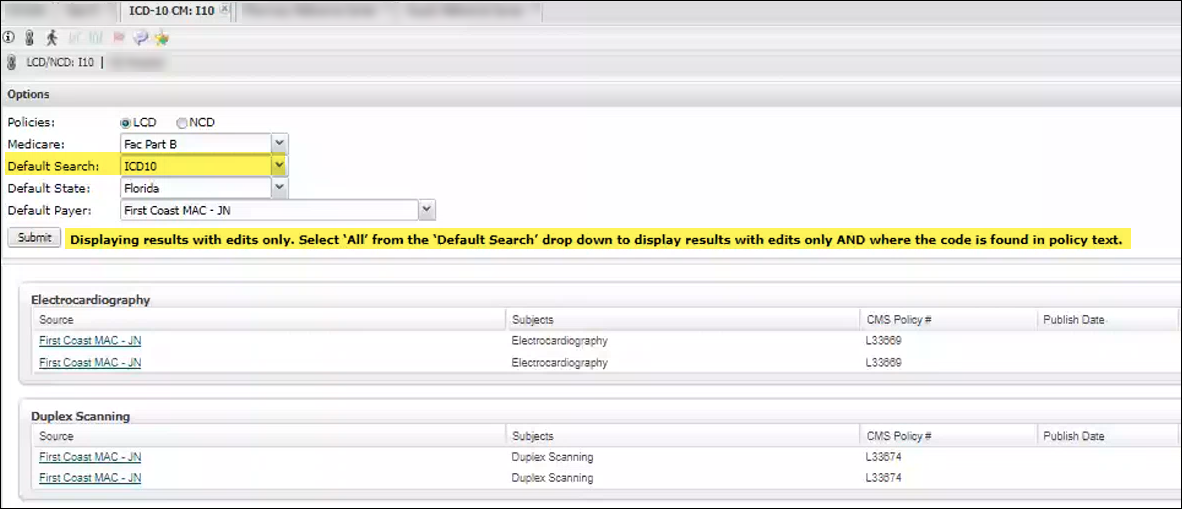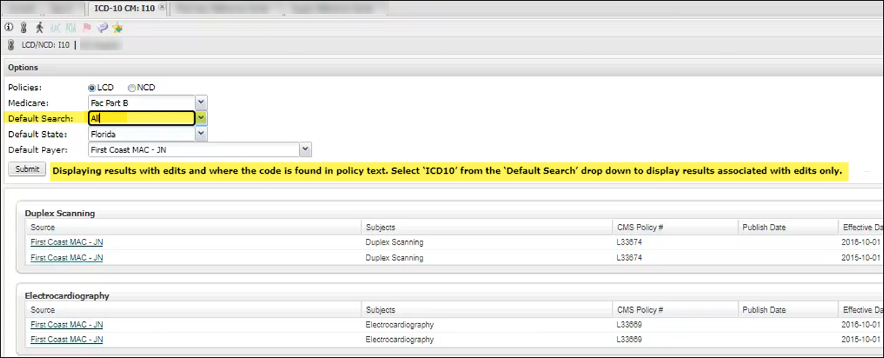 Displaying results with edits AND where the code is found in policy text. Select 'ICD10' from the 'Default Search' drop down to display results associated with edits only.