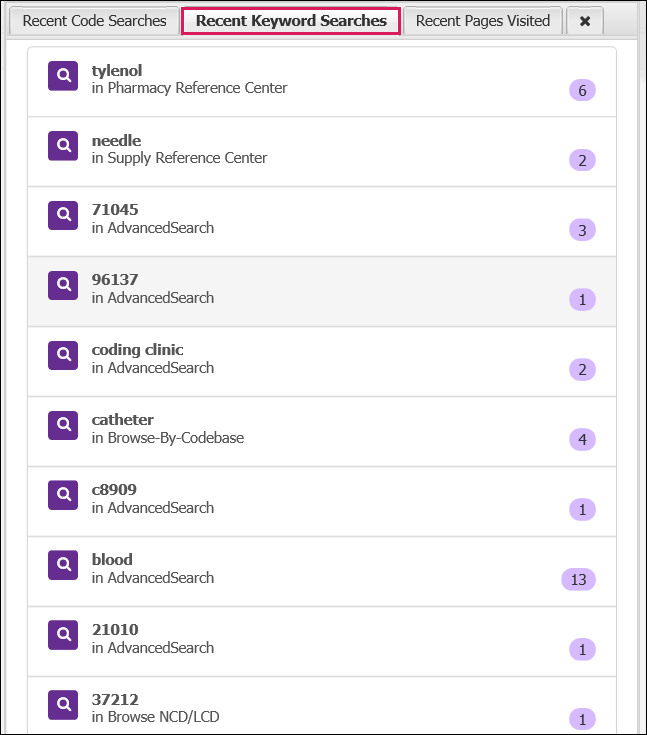 Recent Keyword Searches history displays the 10 most recent keyword or code searches from Advanced Search, Browse, and the Pharmacy and Supply Reference Centers. It also gives the number of times the item was searched for.