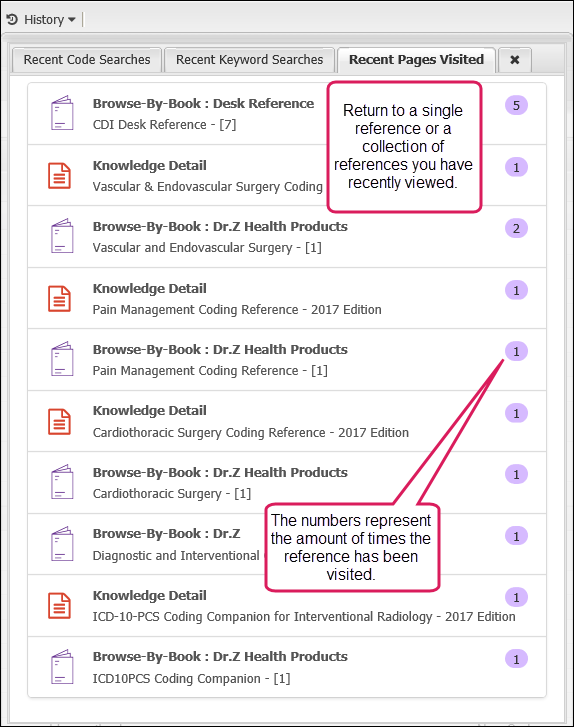 Recent Pages Visited history displays the 10 most recently viewed references or reference collections