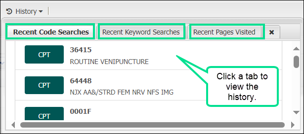 Note: The Date-of-Service does not change when clicking a code from the History menu. For example, if a DOS of August 1, 2018 was selected for the initial code search, when that code is clicked from the History menu, the current DOS remains; it does not revert back to August 1, 2018.