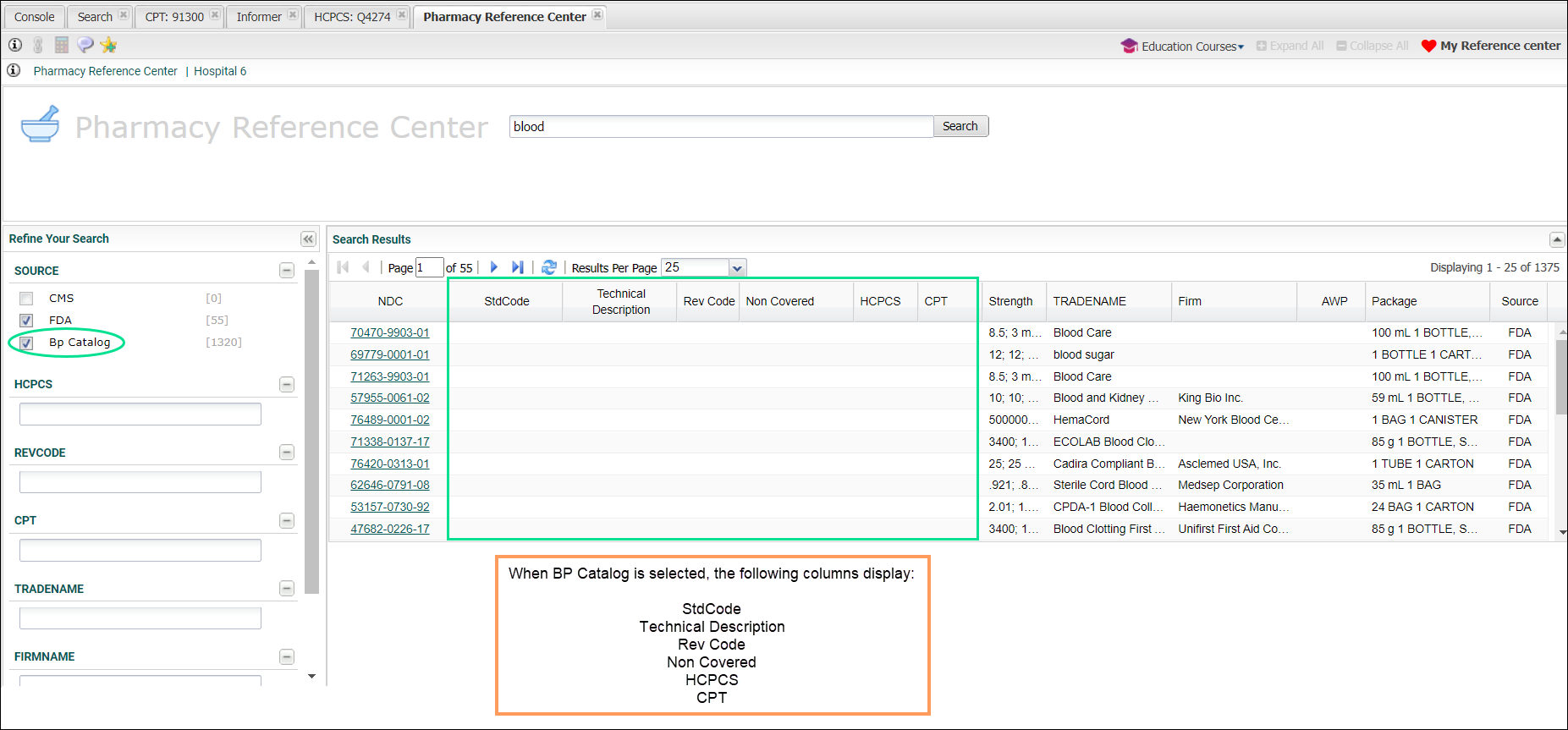 CMS and FDA results display by default. The BP Catalog count still displays. To see BP Catalog results, select the check box. When selected, the following columns display in the Search Results grid: StdCode, Technical Description, Rev Code, Non-Covered, and CPT. BP Catalog results now only display when applicable.