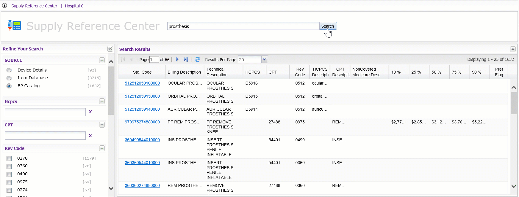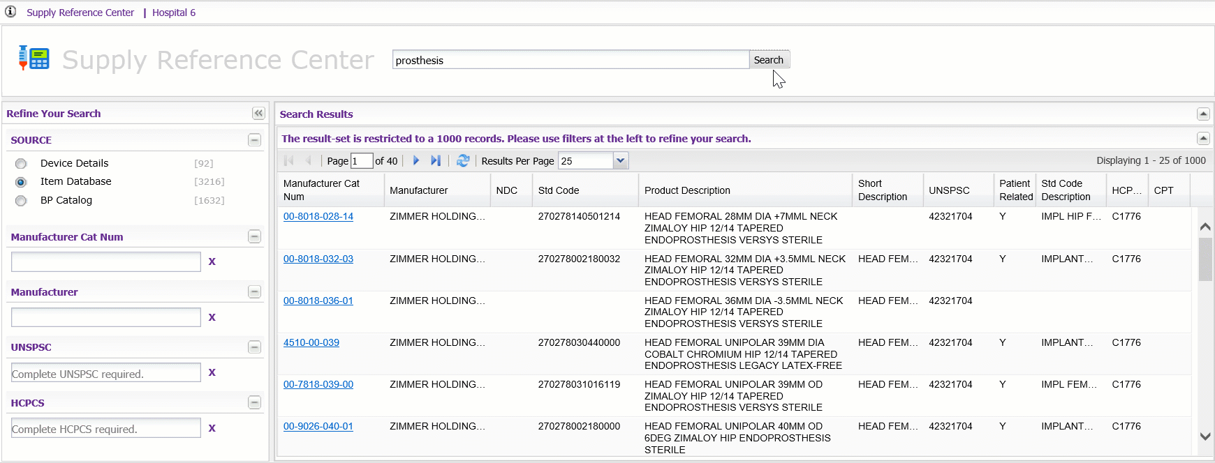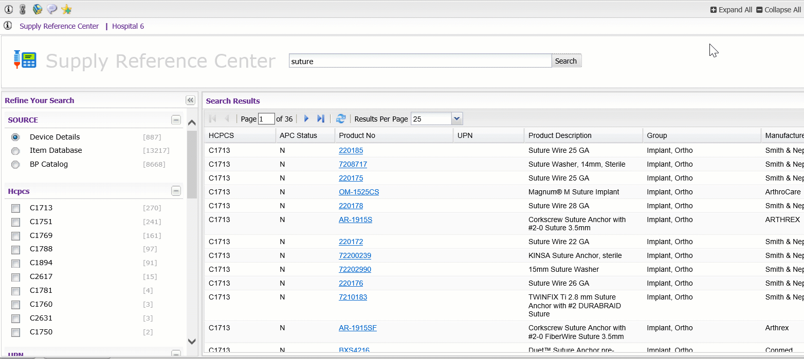 The Supply Reference center leverages three sources when you perform a search: Device Details, Item Database, and BP Catalog.