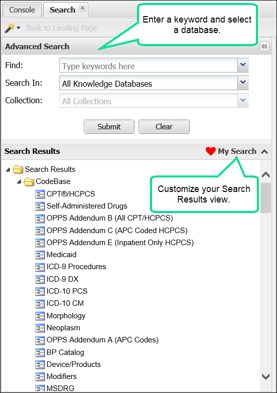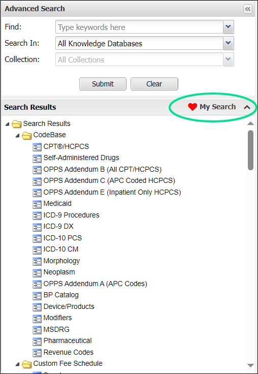 Advanced search lets you refine your code or keyword search by choosing a specific knowledge database and collection to search within.