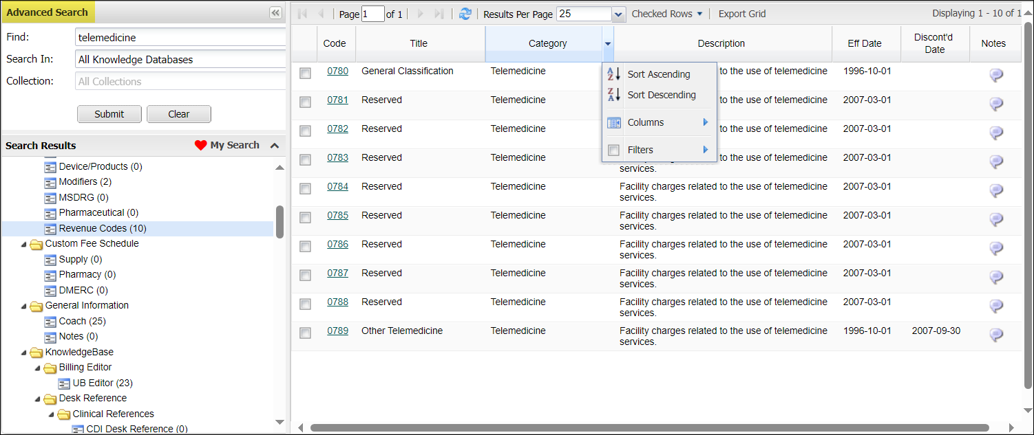 All columns in the Advanced Search results grid are sortable and filterable. You can also select columns to hide or view.