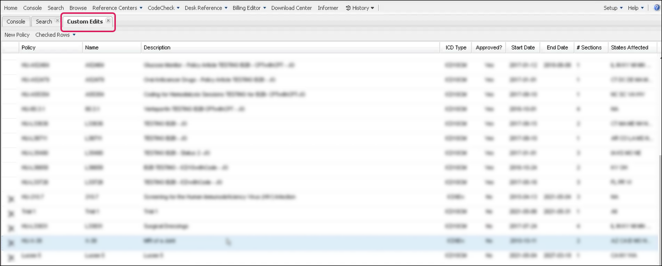 The Custom Edit page is used to customize medical necessity edits. To access the Custom Edits UI, go to Setup > Custom Edits. The Custom Edits interface opens in a new tab with all existing user-defined policies displaying in the grid.