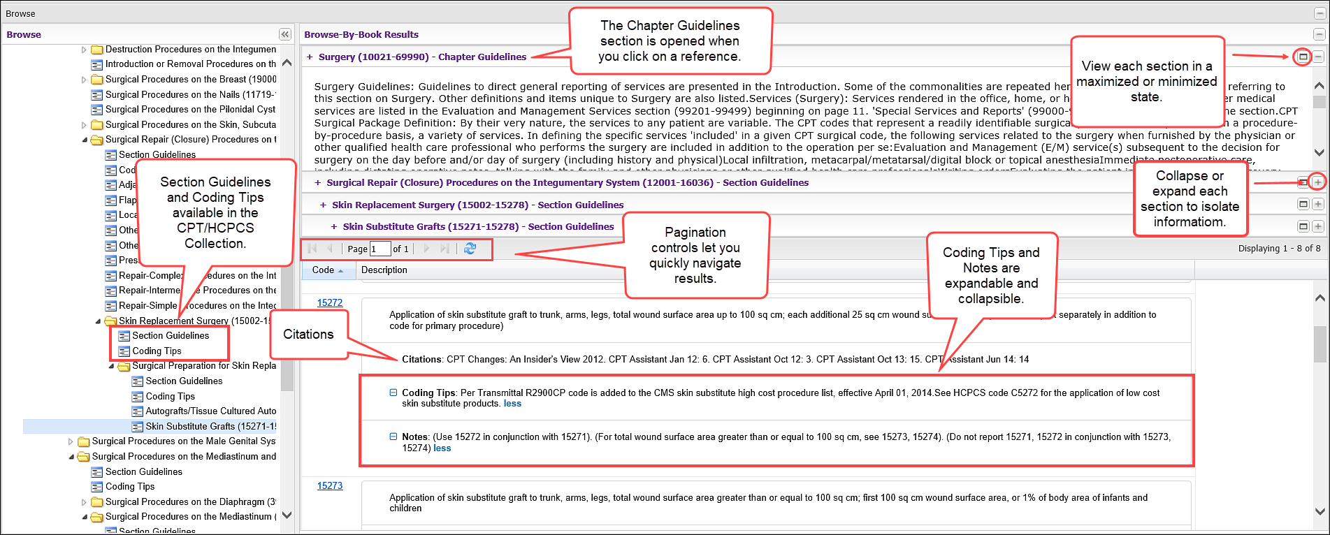 Updated the layout of Browse-By-Book > CPT results. We are enhancing the Browse UI to include more detailed instructions for use. The new, comprehensive design provides user-friendly access to CPT coding information. We will continue to expand the Browse UI to align more with the coding experience in future releases. The current updates include: