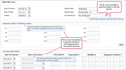 Added tooltips to all fields in the top section of the CMS 1500 form to give users additional information about the field. For the Diagnosis and Procedure sections, tooltips display when the mouse hovers over the headers.