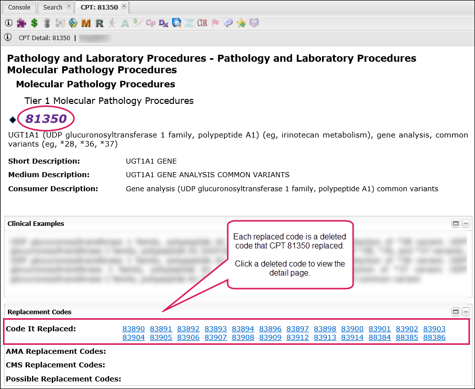 Now, there is! The new Replacement Codes section on the CPT® Detail page gives users a list of replaced codes so they can see exactly which deleted codes were replaced by the selected CPT code.