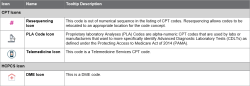 The following icons display (when applicable) next to the selected CPT or HCPCS code on the respective detail page. Hover over the icon to view its description in a tooltip.