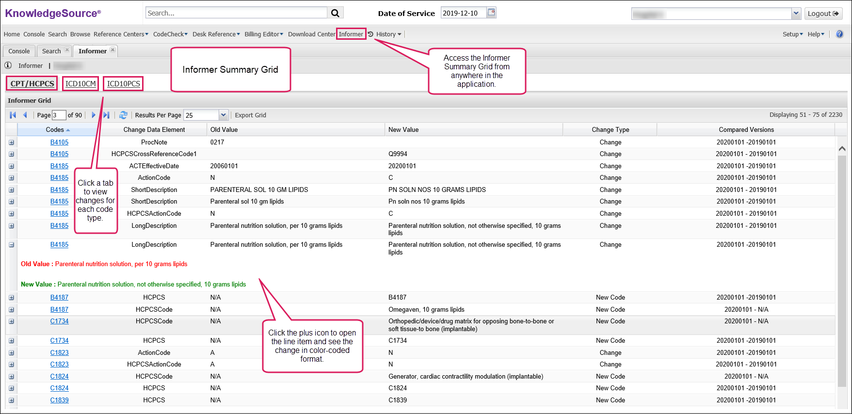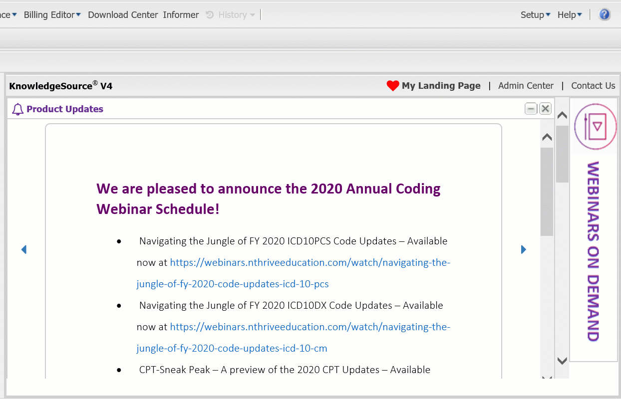 Knowledge Source's multifaceted databases and knowledge engines are designed to unwrap data. The new Informer feature takes the guesswork out of monitoring diagnosis and procedure code changes by delivering the changes directly to the user. Informers empower users by unwrapping billing and coding updates. This helps to decrease coding errors and denials and increase speed to revenue. Know before you go!