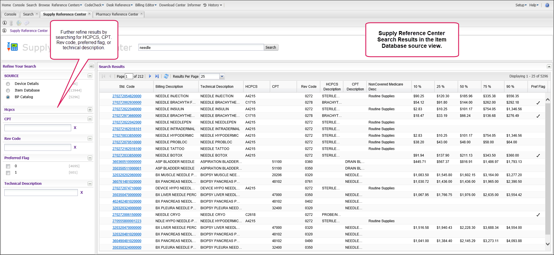 The BP Catalog source view lets users search the BP Catalog database by code details. The Refine Your Search panel gives users the ability to search for HCPCS, CPT, Rev code, preferred flags, or technical descriptions within the search results for the for supply item.