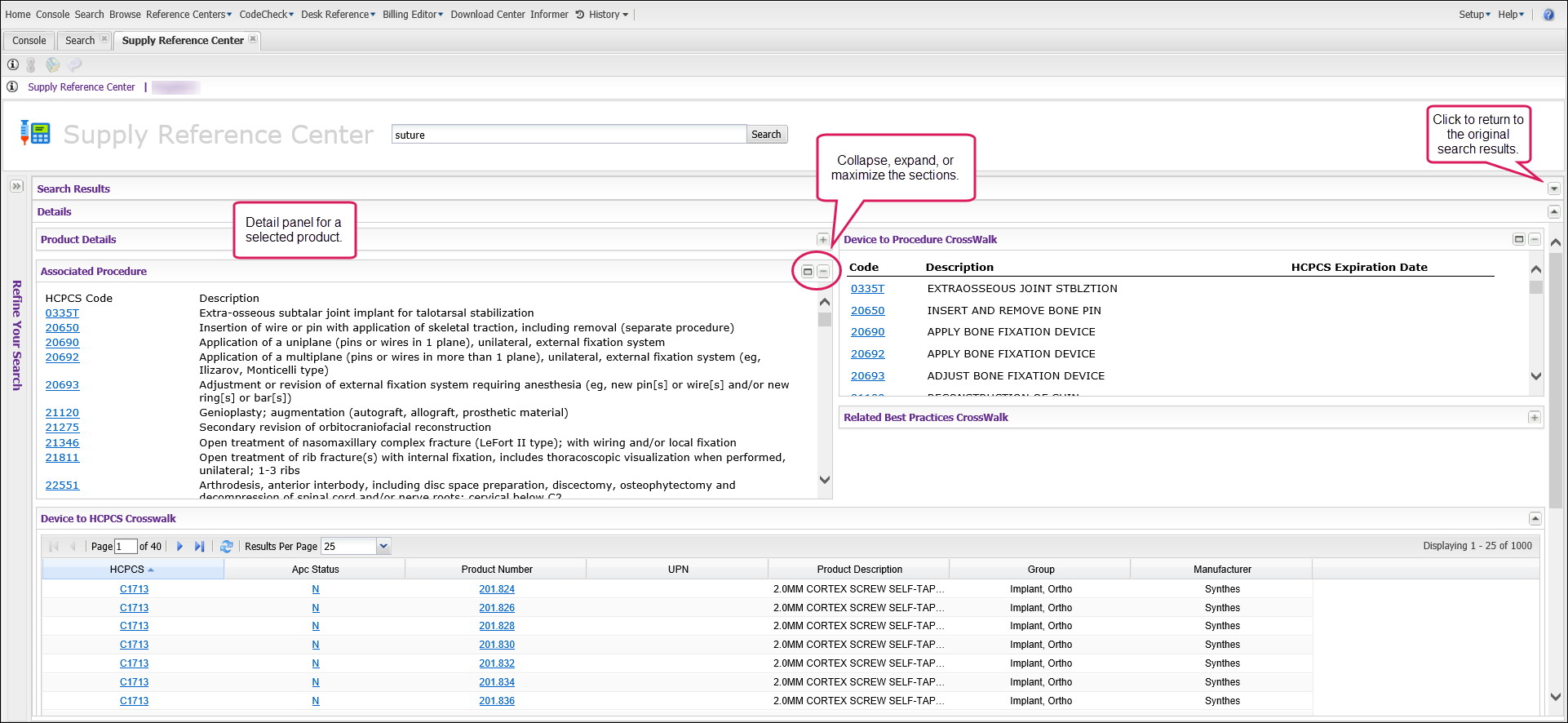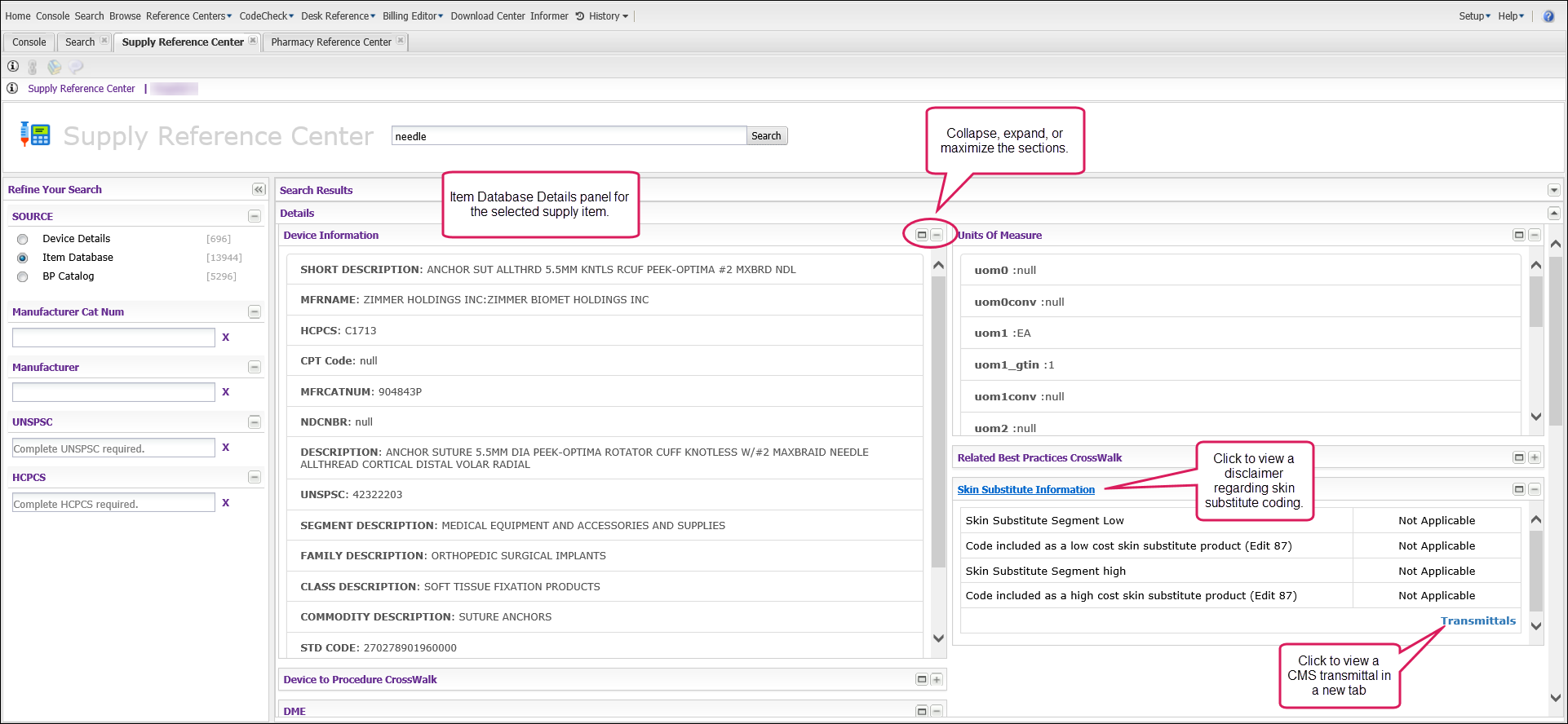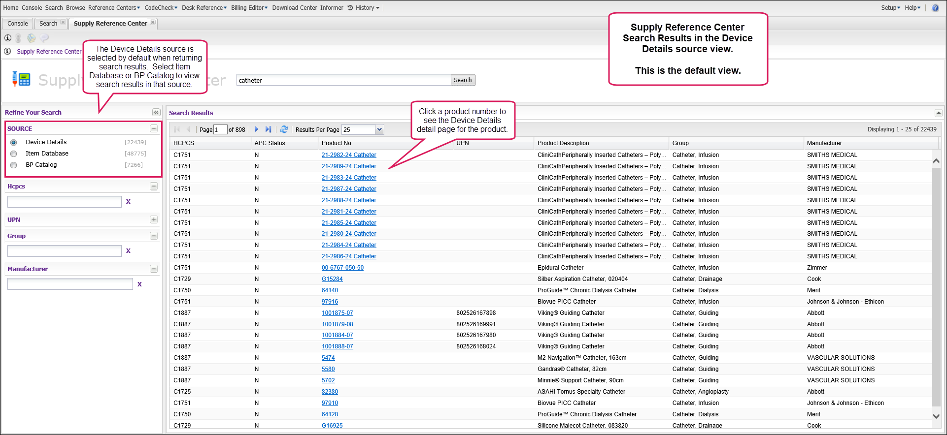 The Supply Reference Center allows users to search for medical devices and products by code, item description, or manufacturer name in one single location. Search results display in grid format with a collapsible Refine Your Search panel to the left.