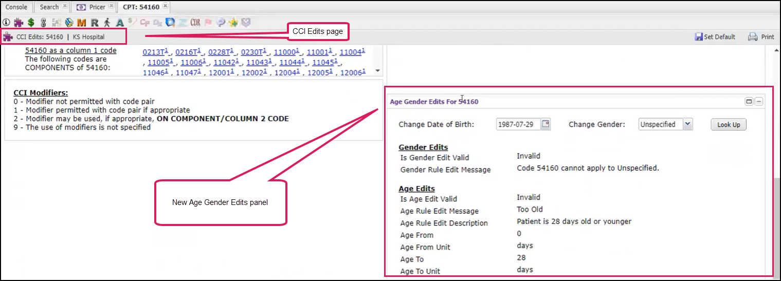 Added an Age Gender Edits panel on the CCI Edits page. This allows users to enter a date-of-birth and gender to look up edits for a particular code.