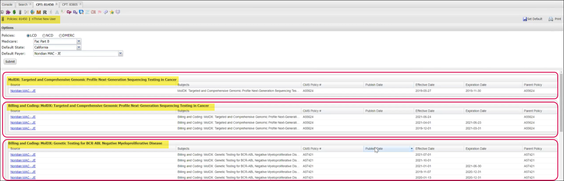 Updated the (LCD, NCD, DMERC) Policies results page so that the information is grouped by subject, allowing users to quickly identify policy details for the selected CPT/HCPCS code.