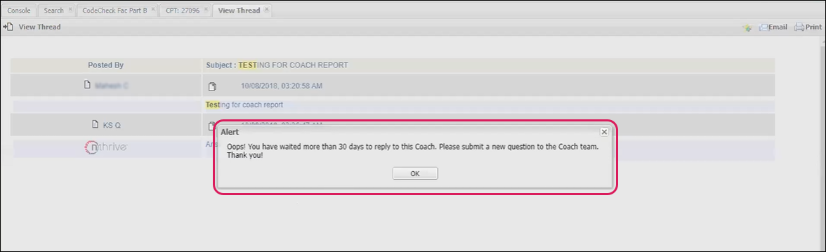 Updated the user response time frame to 30 days for an FinThrive answered Coach question. If a user attempts to reply to an answered Coach question beyond the 30 day threshold, the following alert message displays, advising the user to submit a new Coach question.