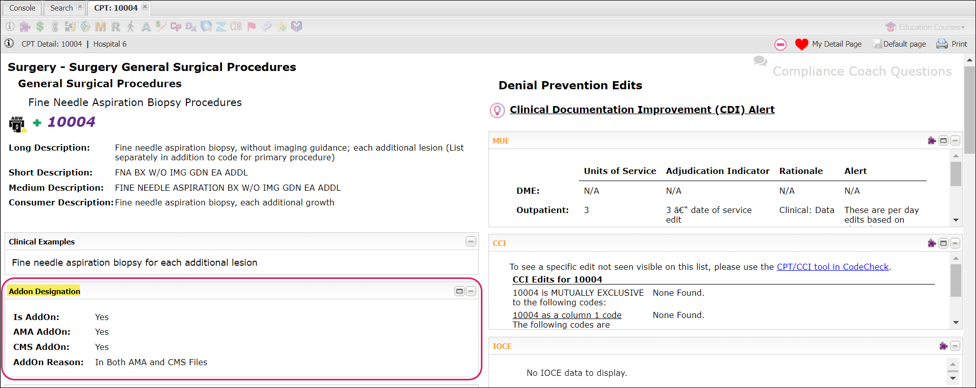 A new AddOn Designation panel is available on the CPT/HCPCS Detail page which alerts users to the add-on code type and designation description. Users should refer to the Coding Tips and Citations panel for additional guidance.