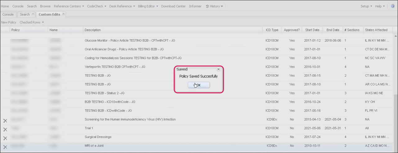 Click Save. The updates are saved to the policy and you are navigated back to the Custom Edits grid.