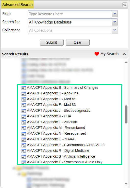 Added the following AMA CPT Appendices The AMA CPT Appendices are included in the coding manuals and provide additional coding information. to the KnowledgeBase > Coding Guidelines section of Advanced Search.