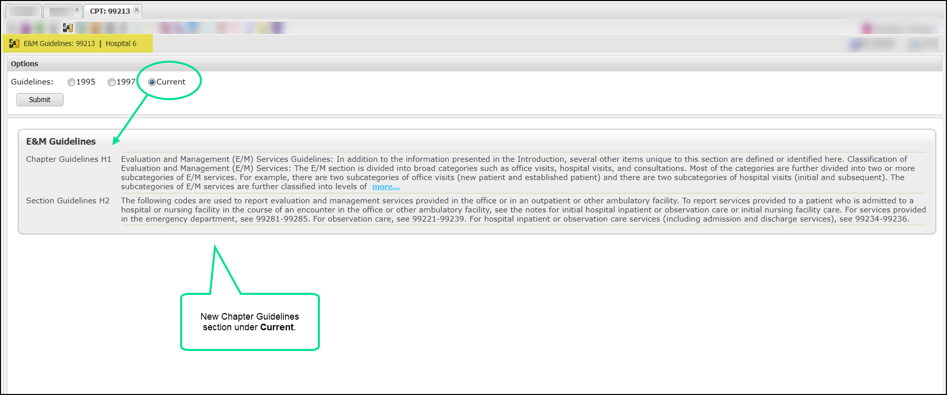 Select the Current radial button and click Submit. The page opens displaying chapter and section guidelines for the respective code.